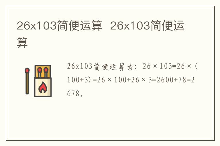 26x103简便运算 26x103简便运算 知识分享 24年12月25日 编辑 童画 取消关注 关注 私信 26×103的简便运算方法如下: 26×103 =26×(100+3) =26×100+26×3 =2600+78 =2678 简便运算是一种特殊的计算,它运用了运算定律与数字的基本性质,从而使计算简便,使一个很复杂的式子变得很容易计算出得数。 No related posts. 本文内容由互联网用户自发贡献,该文观点仅代表作者本人。本站仅提供信息存储空间服务,不拥有所有权,不承担相关法律责任。如发现本站有涉嫌抄袭侵权/违法违规的内容, 请发送邮件至 2245678901@qq.com 举报,一经查实,本站将立刻删除。 给TA打赏 共{{data.count}}人 人已打赏