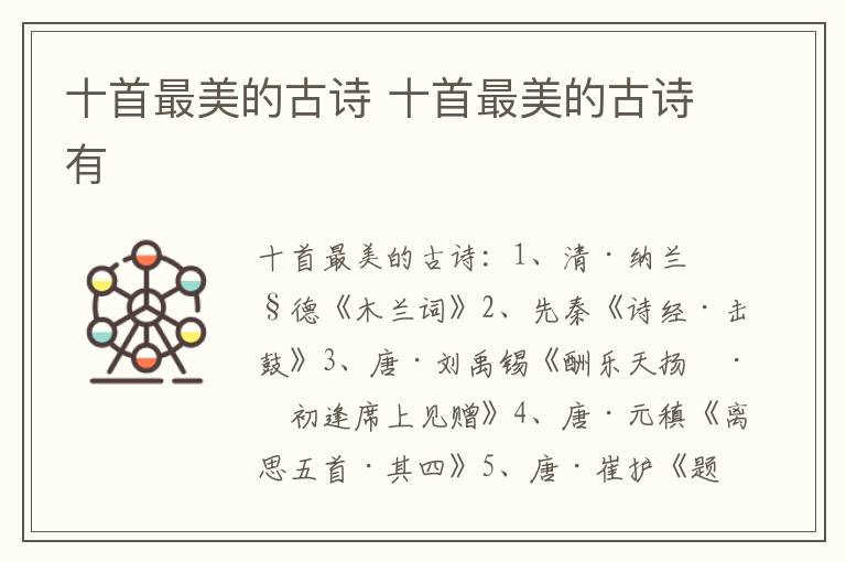 十首最美的古诗:1、清·纳兰性德《木兰词》2、先秦《诗经·击鼓》3、唐·刘禹锡《酬乐天扬州初逢席上见赠》4、唐·元稹《离思五首·其四》5、唐·崔护《题都城南庄》6、宋·苏轼《江城子》7、唐·李商隐《锦瑟》8、唐·张九龄《望月怀远》9、宋·辛弃疾《青玉案·元夕》10、宋·苏轼《定风波》