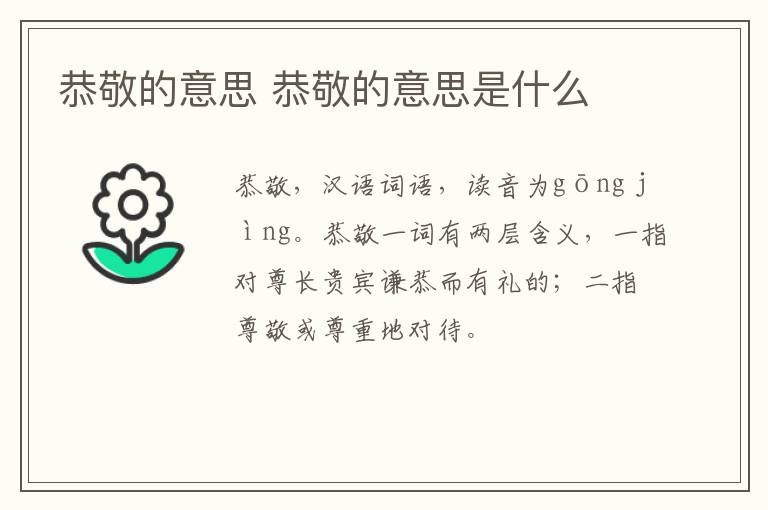 恭敬,汉语词语,读音为gōngjìng。恭敬一词有两层含义,一指对尊长贵宾谦恭而有礼的;二指尊敬或尊重地对待。词语出自《孟子·告子上》:“恭敬之心,人皆有之。”