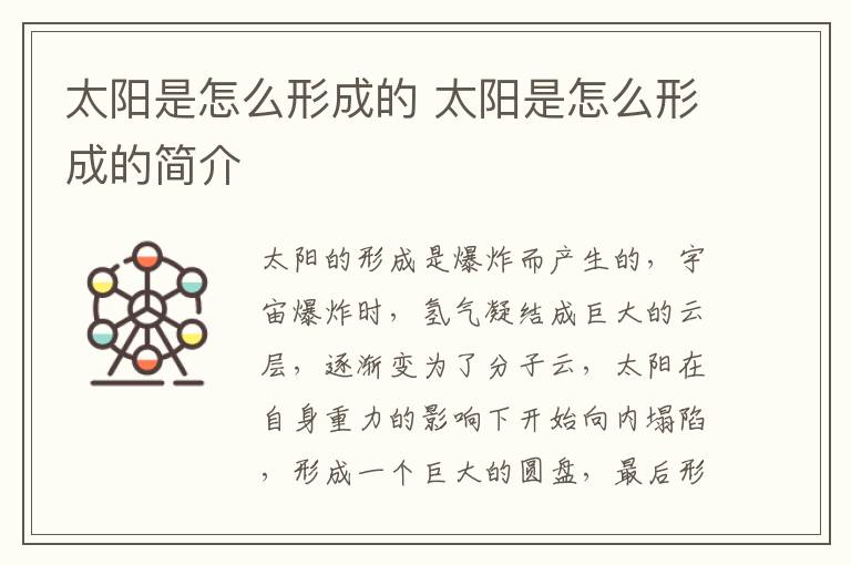 太阳的形成是爆炸而产生的,宇宙爆炸时,氢气凝结成巨大的云层,逐渐变为了分子云,太阳在自身重力的影响下开始向内塌陷,形成一个巨大的圆盘,最后形成了气球体,原子在内部发生核聚变,因此形成了太阳。太阳是太阳系的中心天体,占有太阳系总体质量的99.86%。太阳系中的八大行星、小行星、流星、彗星、外海王星天体以及星际尘埃等,都围绕着太阳公转,而太阳则围绕着银河系的中心公转。