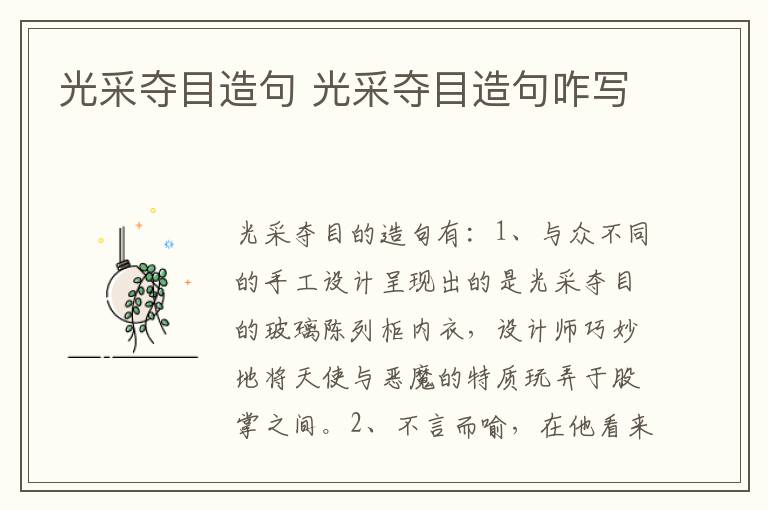 光采夺目的造句有:1、与众不同的手工设计呈现出的是光采夺目的玻璃陈列柜内衣,设计师巧妙地将天使与恶魔的特质玩弄于股掌之间。2、不言而喻,在他看来,生命本身是最重要的、最光采夺目的艺术,而其他形形色色的艺术都不过是准备好献给它的。3、常震只觉现在的她,就像太阳一样光采夺目,看一眼就会闪痛眼睛,又像月亮一样明艳照人,看一眼就会终生难忘。