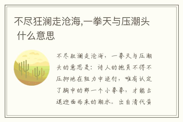 不尽狂澜走沧海,一拳天与压潮头的意思是:诗人的抱负不得不压抑地在阻力中逆行,唯有认定了胸中的那一个小拳拳,才能击退迎面而来的潮水。出自清代诗人黄仲则的《登北固楼》,全诗为:振衣直上最高楼,吴楚青苍一望收。此地山形常北顾,千年江水自东流。乾坤莽莽鱼龙气,今古愔愔花月愁。不尽狂澜走沧海,一拳天与压潮头。