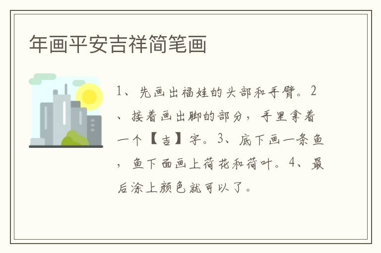 年画平安吉祥简笔画 知识分享 1月10日 编辑 童画 取消关注 关注 私信 1、先画出福娃的头部和手臂。 2、接着画出脚的部分,手里拿着一个【吉】字。 3、底下画一条鱼,鱼下面画上荷花和荷叶。 4、最后涂上颜色就可以了。 No related posts. 本文内容由互联网用户自发贡献,该文观点仅代表作者本人。本站仅提供信息存储空间服务,不拥有所有权,不承担相关法律责任。如发现本站有涉嫌抄袭侵权/违法违规的内容, 请发送邮件至 2245678901@qq.com 举报,一经查实,本站将立刻删除。 给TA打赏 共{{data.count}}人 人已打赏