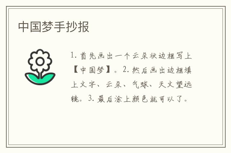 中国梦手抄报 知识分享 1月6日 编辑 童画 取消关注 关注 私信 1.首先画出一个云朵状边框写上【中国梦】。 2.然后画出边框填上文字、云朵、气球、天文望远镜。 3.最后涂上颜色就可以了。 No related posts. 本文内容由互联网用户自发贡献,该文观点仅代表作者本人。本站仅提供信息存储空间服务,不拥有所有权,不承担相关法律责任。如发现本站有涉嫌抄袭侵权/违法违规的内容, 请发送邮件至 2245678901@qq.com 举报,一经查实,本站将立刻删除。 给TA打赏 共{{data.count}}人 人已打赏