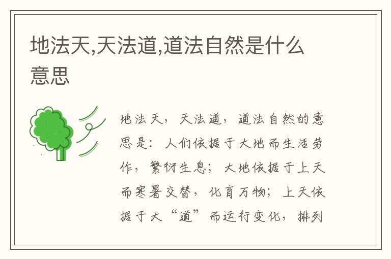 地法天,天法道,道法自然的意思是:人们依据于大地而生活劳作,繁衍生息;大地依据于上天而寒暑交替,化育万物;上天依据于大“道”而运行变化,排列时序;大“道”则依据自然之性,顺其自然而成其所以然。这句话出自《道德经》。