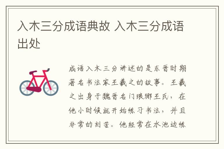 成语入木三分讲述的是东晋时期著名书法家王羲之的故事。王羲之出身于魏晋名门琅琊王氏,在他小时候就开始练习书法,并且非常的刻苦。他经常在水池边练字,结果连池水都快被染黑了。有一天,他把字写在木板上,拿给刻字的人照着雕刻。这个人先用刀削木板,却发现笔迹竟然透进木板里有三分深度,这件事情轰动了整个京城,“入木三分”因此而得。