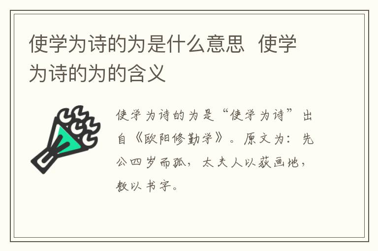 使学为诗的为是“使学为诗”出自《欧阳修勤学》。原文为:先公四岁而孤,太夫人以荻[dí]画地,教以书字。多诵古人篇章,使学为诗。及稍长,而家贫无书读,就闾[lǘ]里士人家借而读之,或因而抄录。抄录未必,而已能诵其书。以至昼夜忘寝食,惟读书是务。自幼所作诗赋文字,下笔已如成人。