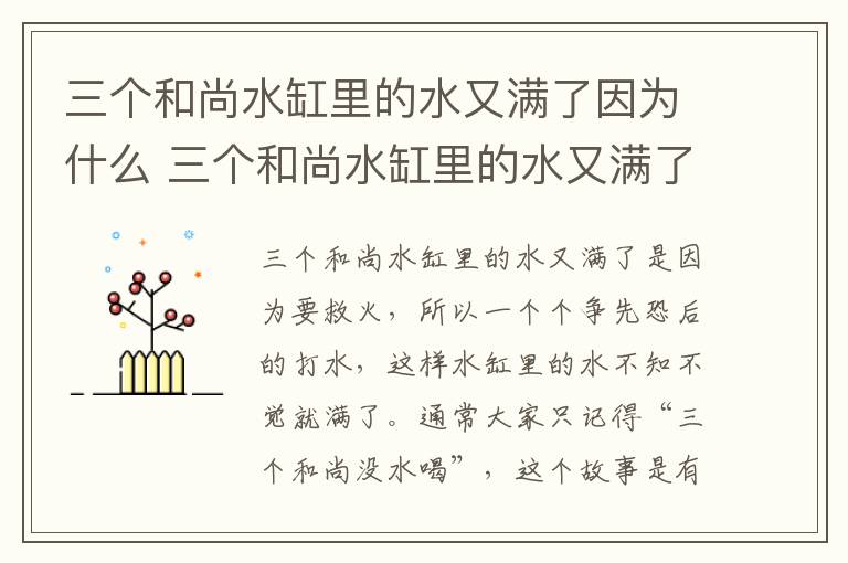 三个和尚水缸里的水又满了是因为要救火,所以一个个争先恐后的打水,这样水缸里的水不知不觉就满了。通常大家只记得“三个和尚没水喝”,这个故事是有后续的。小庙被一根蜡烛点燃,火势逐渐扩大,为了安全和安居,三个和尚急忙打水灭火。这也体现了三个和尚之间的团结、有爱精神。