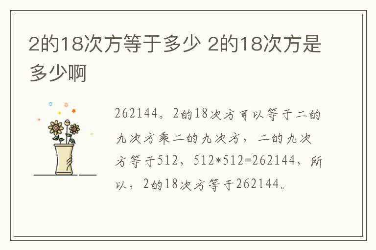 2的18次方等于多少 2的18次方是多少啊 知识分享 1月16日 编辑 童画 取消关注 关注 私信 2的18次方等于262144。2的18次方可以等于二的九次方乘二的九次方,二的九次方等于512,512*512=262144,所以,2的18次方等于262144。 No related posts. 本文内容由互联网用户自发贡献,该文观点仅代表作者本人。本站仅提供信息存储空间服务,不拥有所有权,不承担相关法律责任。如发现本站有涉嫌抄袭侵权/违法违规的内容, 请发送邮件至 2245678901@qq.com 举报,一经查实,本站将立刻删除。 给TA打赏 共{{data.count}}人 人已打赏
