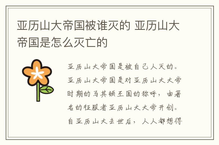 亚历山大帝国是被自己人灭的。亚历山大帝国是对亚历山大大帝时期的马其顿王国的称呼,由著名的征服者亚历山大大帝开创。自亚历山大去世后,人人都想得到亚历山大的政权,从而开始明争暗斗,帝国陷入四分五裂的境地,一个空前强大的帝国仅仅维持了很短的时间便走向了瓦解。