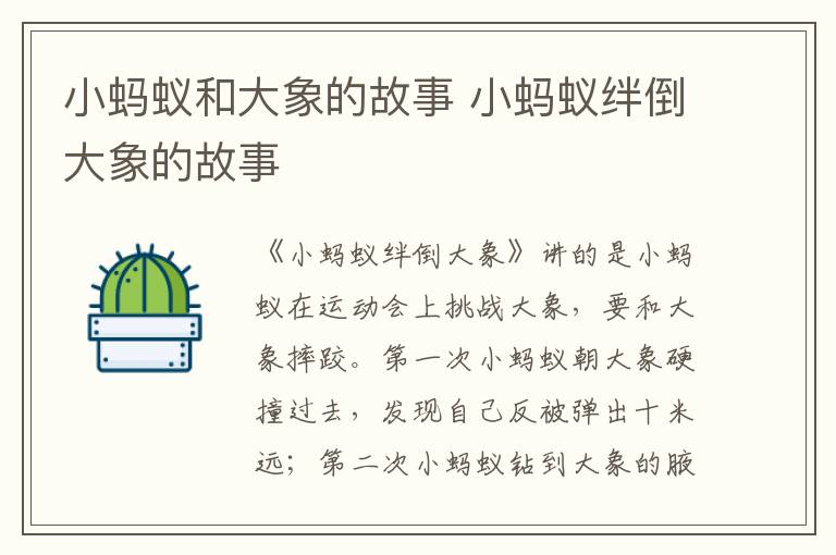 《小蚂蚁绊倒大象》讲的是小蚂蚁在运动会上挑战大象,要和大象摔跤。第一次小蚂蚁朝大象硬撞过去,发现自己反被弹出十米远;第二次小蚂蚁钻到大象的腋窝处,用触角挠大象的痒痒,大象笑倒在地,最后小蚂蚁战胜了大象的故事。