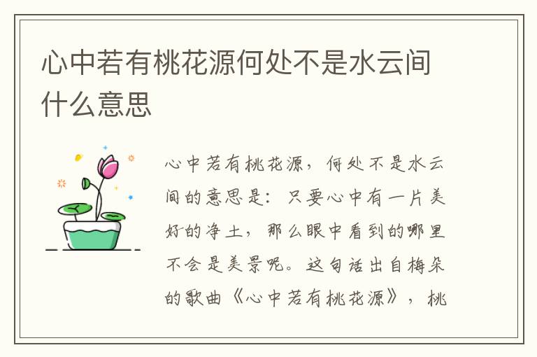 心中若有桃花源,何处不是水云间的意思是:只要心中有一片美好的净土,那么眼中看到的哪里不会是美景呢。这句话出自梅朵的歌曲《心中若有桃花源》,桃花源出自晋代陶渊明的《桃花源记》,比作为人间仙境,为隐士避世之所。水云间出自琼瑶的《梅花三弄之水云间》,表示美好的地方。
