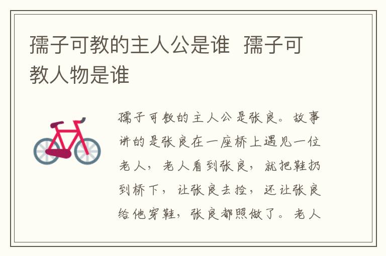 孺子可教的主人公是张良。故事讲的是张良在一座桥上遇见一位老人,老人看到张良,就把鞋扔到桥下,让张良去捡,还让张良给他穿鞋,张良都照做了。老人让他五天后来找他,五天后张良到的比老人晚,老人让他五天后再来。又过了五天,张良再次来到桥上,又比老人晚到,老人十分生气。又五天后张良半夜就到了桥上,终于比老人早到了。这次老人很高兴,送给他一本兵书。张良日夜攻读这本兵书,后来助刘邦统一了天下。