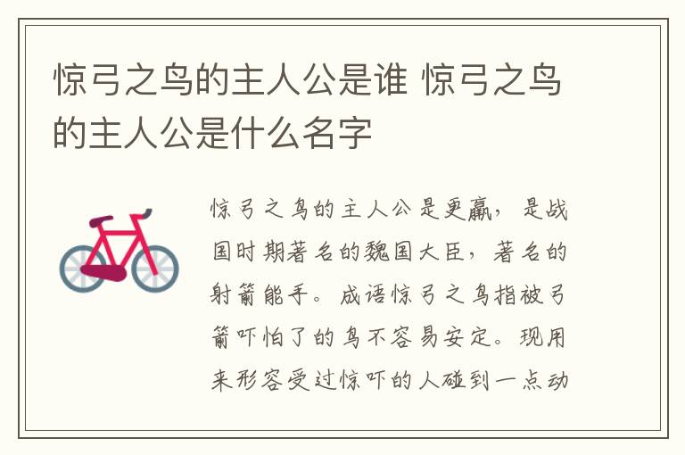 惊弓之鸟的主人公是更羸,是战国时期著名的魏国大臣,著名的射箭能手。成语惊弓之鸟指被弓箭吓怕了的鸟不容易安定。现用来形容受过惊吓的人碰到一点动静就非常害怕,出自于《战国策·楚策四》。