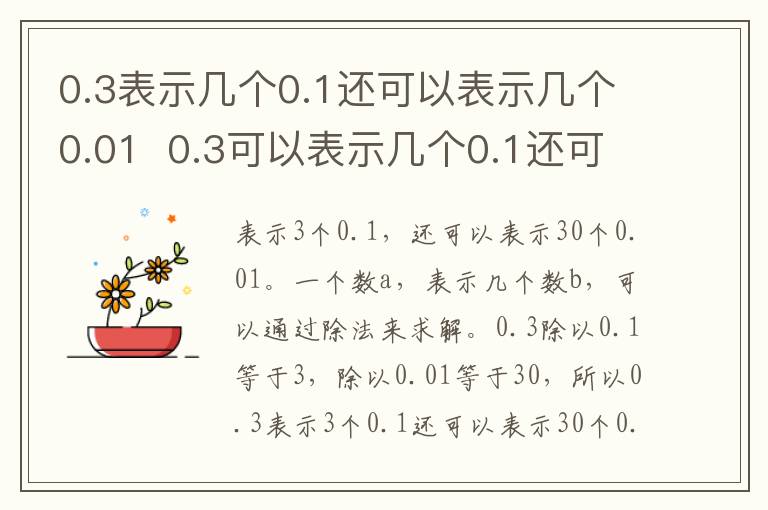 0.3表示几个0.1还可以表示几个0.01 0.3可以表示几个0.1还可以表示几个0.01 知识分享 1月10日 编辑 童画 取消关注 关注 私信 0.3表示3个0.1,还可以表示30个0.01。一个数a,表示几个数b,可以通过除法来求解。0.3除以0.1等于3,除以0.01等于30,所以0.3表示3个0.1还可以表示30个0.01。 No related posts. 本文内容由互联网用户自发贡献,该文观点仅代表作者本人。本站仅提供信息存储空间服务,不拥有所有权,不承担相关法律责任。如发现本站有涉嫌抄袭侵权/违法违规的内容, 请发送邮件至 2245678901@qq.com 举报,一经查实,本站将立刻删除。 给TA打赏 共{{data.count}}人 人已打赏