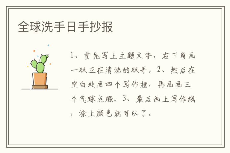全球洗手日手抄报 知识分享 1月10日 编辑 童画 取消关注 关注 私信 1、首先写上主题文字,右下角画一双正在清洗的双手。 2、然后在空白处画四个写作框,再画画三个气球点缀。 3、最后画上写作线,涂上颜色就可以了。 No related posts. 本文内容由互联网用户自发贡献,该文观点仅代表作者本人。本站仅提供信息存储空间服务,不拥有所有权,不承担相关法律责任。如发现本站有涉嫌抄袭侵权/违法违规的内容, 请发送邮件至 2245678901@qq.com 举报,一经查实,本站将立刻删除。 给TA打赏 共{{data.count}}人 人已打赏