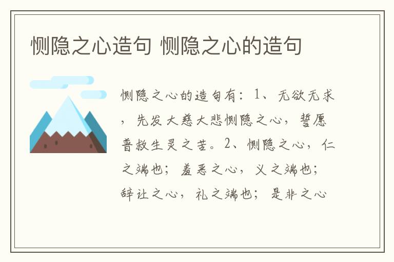 恻隐之心的造句有:1、无欲无求,先发大慈大悲恻隐之心,誓愿普救生灵之苦。2、恻隐之心,仁之端也;羞恶之心,义之端也;辞让之心,礼之端也;是非之心,智之端也。君子之所以教者五:有如时雨化之者,有成德者,有达财者,有答问者,有私淑艾者。此五者,君子之所以教也。3、恻隐之心,人皆有之。