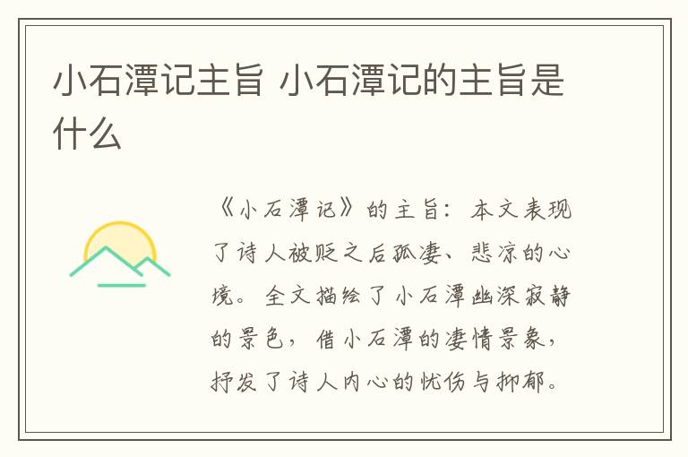 《小石潭记》的主旨:本文表现了诗人被贬之后孤凄、悲凉的心境。全文描绘了小石潭的幽深寂静的景色,借小石潭凄情、幽静的之景,抒发了诗人内心忧伤抑郁的心情。