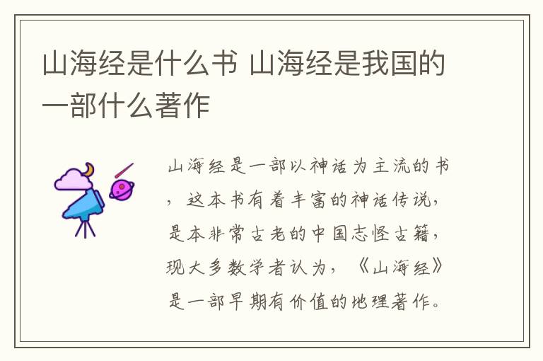 山海经是一部以神话为主流的书,这本书有着丰富的神话传说,是本非常古老的中国志怪古籍,现大多数学者认为,《山海经》是一部早期有价值的地理著作。