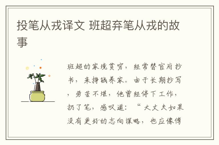 《投笔从戎》的译文:班超的家境贫穷,经常替官府抄书,来挣钱养家。由于长期抄写,劳苦不堪,他曾经停下工作,扔了笔,感叹道:“