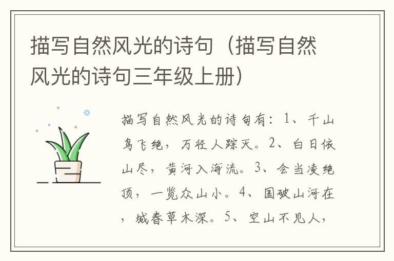 描写自然风光的诗句1、千山鸟飞绝,万径人踪灭。2、白日依山尽,黄河入海流。3、会当凌绝顶,一览众山小。4、国破山河在,城春草木深。5、空山不见人,但闻人语响。6、明月出天山,苍茫云海间。7、当日相看两不厌,如今只有敬亭山。8、种豆南山下,草盛豆苗稀。9、青山遮不住,毕竟东流去,在水一方。诗中山