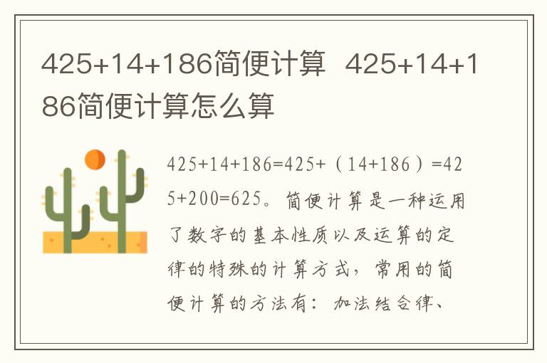 简便计算是一种运用了数字的基本性质以及运算的定律的特殊的计算方式,常用的简便计算的方法有:加法结合律、加法交换律、乘法结合律、乘法分配律、乘法交换律。在425+14+186的简便计算过程中,使用的是加法结合律。