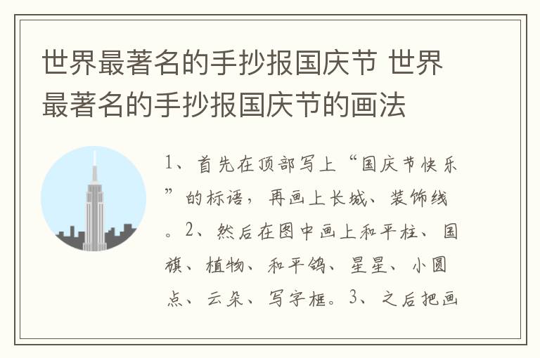 世界最著名的手抄报国庆节 世界最著名的手抄报国庆节的画法 知识分享 1月17日 编辑 童画 取消关注 关注 私信 1、首先在顶部写上“国庆节快乐”的标语,再画上长城、装饰线。 2、然后在图中画上和平柱、国旗、植物、和平鸽、星星、小圆点、云朵、写字框。 3、之后把画好的元素涂上相应的颜色。 4、最后在写字框内写上文字即可。 No related posts. 本文内容由互联网用户自发贡献,该文观点仅代表作者本人。本站仅提供信息存储空间服务,不拥有所有权,不承担相关法律责任。如发现本站有涉嫌抄袭侵权/违法违规的内容, 请发送邮件至 2245678901@qq.com 举报,一经查实,本站将立刻删除。 给TA打赏 共{{data.count}}人 人已打赏