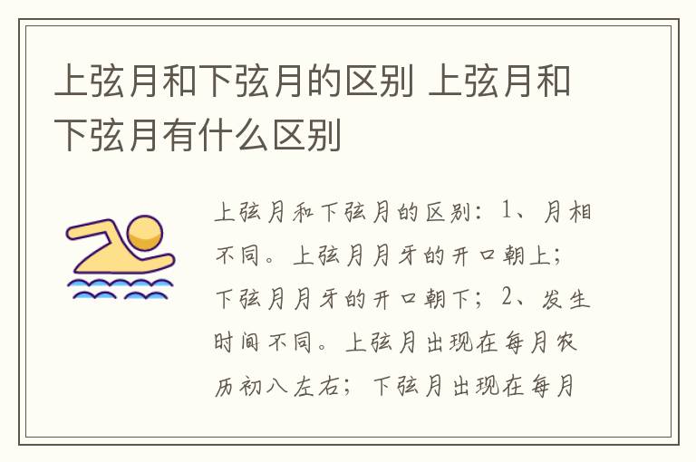 上弦月和下弦月的区别:1、月相不同。上弦月月牙的开口朝上;下弦月月牙的开口朝下;2、发生时间不同。上弦月出现在每月农历初八左右;下弦月出现在每月农历二十三左右;3、出现位置不同。上弦月出现在傍晚至前半夜的西边天空,西半边亮;下弦月出现在凌晨至后半夜的东边天空,东半边亮。