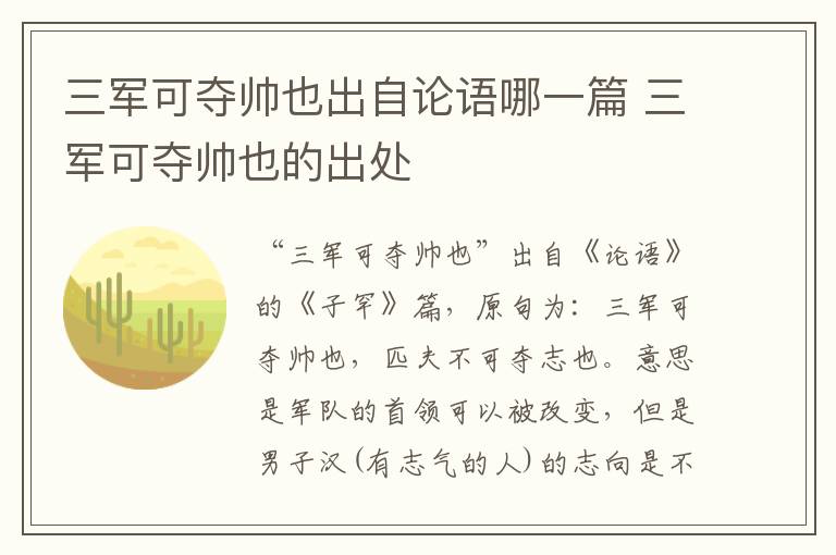 “三军可夺帅也”出自《论语》的《子罕》篇,原句为:三军可夺帅也,匹夫不可夺志也。意思是军队的首领可以被改变,但是男子汉(有志气的人)的志向是不能被改变的。《论语·子罕》涉及孔子的道德教育思想,孔子弟子对其师的议论,此外,还记述了孔子的某些活动。《论语·子罕》中“子罕”与人物子罕并不是同一回事。在这里,“子”指孔子;“罕”是表示频率的副词,即“少也”。