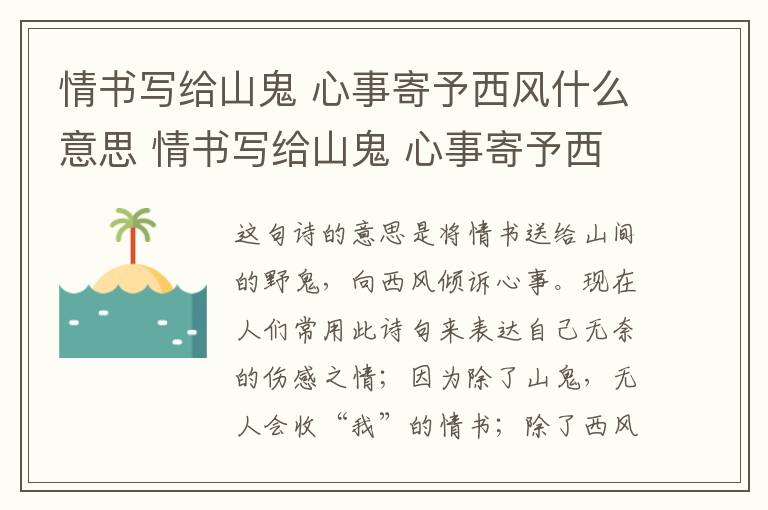 “情书写给山鬼,心事寄予西风”这句诗的意思是将情书送给山间的野鬼,向西风倾诉心事。现在人们常用此诗句来表达自己无奈的伤感之情;因为除了山鬼,无人会收“我”的情书;除了西风,没人能倾听“我”的心事。
