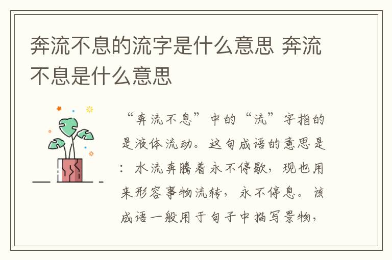 “奔流不息”中的“流”字指的是液体流动。这句成语的意思是,水流奔腾着永不停歇,现也用来形容事物流转,永不停息。该成语一般用于句子中描写景物,或用于某种精神、力量延续不断。如:黄河奔流不息,养育了一代代的华夏儿女。