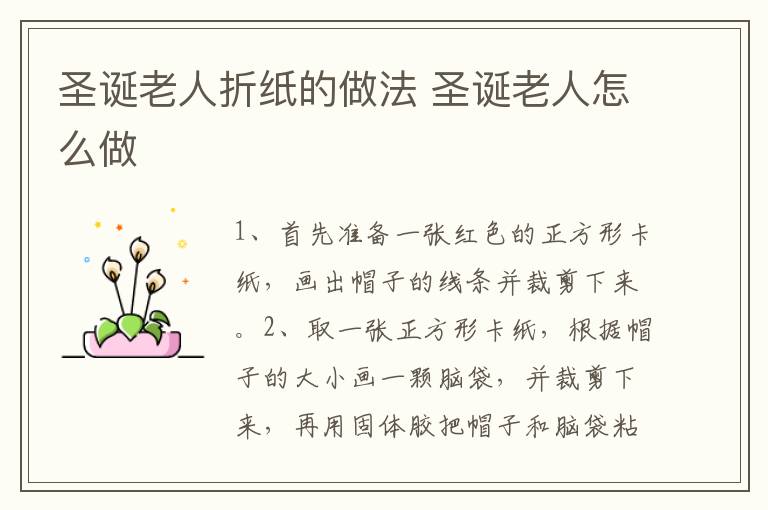 圣诞老人折纸的做法 圣诞老人怎么做 知识分享 1月14日 编辑 童画 取消关注 关注 私信 1、首先准备一张红色的正方形卡纸,画出帽子的线条并裁剪下来。 2、取一张正方形卡纸,根据帽子的大小画一颗脑袋,并裁剪下来,再用固体胶把帽子和脑袋粘合。 3、取一张正方形卡纸折成扇形,并和脑袋粘合。在脑袋上画出眼睛,做一个红鼻子粘上。 4、再做一个白色的帽尖并粘上,一个圣诞老人就做好了。 No related posts. 本文内容由互联网用户自发贡献,该文观点仅代表作者本人。本站仅提供信息存储空间服务,不拥有所有权,不承担相关法律责任。如发现本站有涉嫌抄袭侵权/违法违规的内容, 请发送邮件至 2245678901@qq.com 举报,一经查实,本站将立刻删除。 给TA打赏 共{{data.count}}人 人已打赏