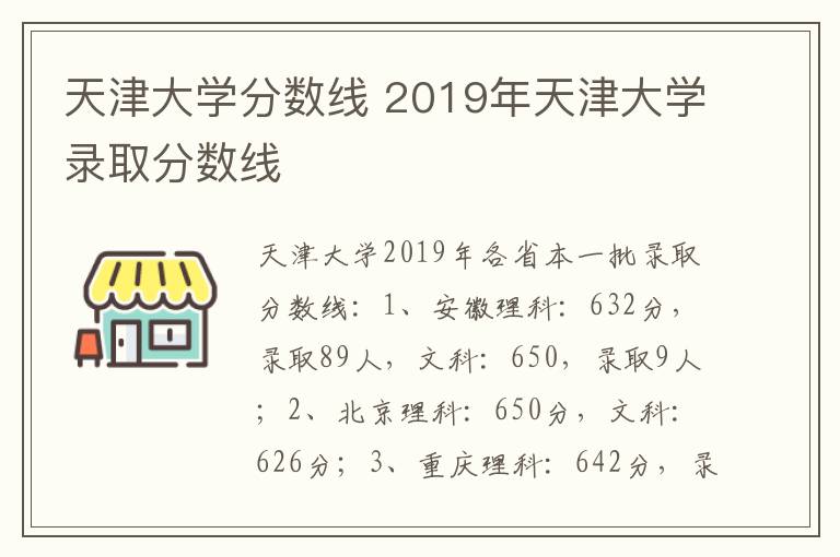 天津大学2019年各省本一批录取分数线:1、安徽理科:632分,录取89人,文科:650,录取9人;2、北京理科:650分,文科:626分;3、重庆理科:642分,录取55人,文科:620,录取5人;4、福建文科:613分,理科:611分。