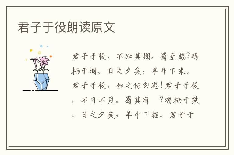 君子于役朗读原文 知识分享 1月10日 编辑 童画 取消关注 关注 私信 君子于役,不知其期。曷至哉?鸡栖于埘。日之夕矣,羊牛下来。君子于役,如之何勿思!君子于役,不日不月。曷其有佸?鸡栖于桀。日之夕矣,羊牛下括。君子于役,苟无饥渴? 《君子于役》写的是一个妇女思念在外服徭役的丈夫。诗中写这位妇女的心理非常细致真实,从侧面写出了繁重的徭役给千百个家庭带来的痛苦。 No related posts. 本文内容由互联网用户自发贡献,该文观点仅代表作者本人。本站仅提供信息存储空间服务,不拥有所有权,不承担相关法律责任。如发现本站有涉嫌抄袭侵权/违法违规的内容, 请发送邮件至 2245678901@qq.com 举报,一经查实,本站将立刻删除。 给TA打赏 共{{data.count}}人 人已打赏
