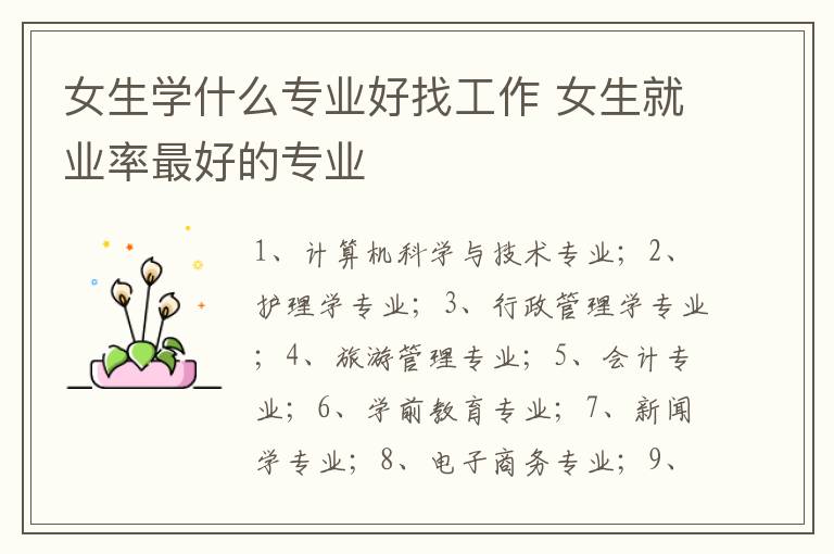 8、电子商务专业:对于女生而言,从事电子商务的网络营销编辑是个不错的就业方向,日常上班不必风吹日晒,相对来说工作强度也不是很大,而选择电子商务专业的同学就业选择性较多,可谓是一门比较容易就业的专业。