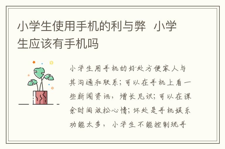 小学生用手机的好处方便家人与其沟通和联系;可以在手机上看一些新闻资讯,增长见识;可以在课余时间放松心情;坏处是手机娱乐功能太多,小学生不能控制玩手机的时间,容易影响孩子的学习;上课手机响的话还会影响老师讲课。