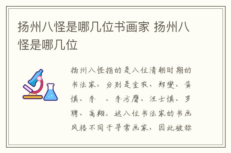 扬州八怪指的是八位清朝时期的书法家,分别是金农、郑燮、黄慎、李鱓、李方膺、汪士慎、罗聘、高翔。这八位书法家的书画风格不同于寻常画家,因此被称作“八怪”。