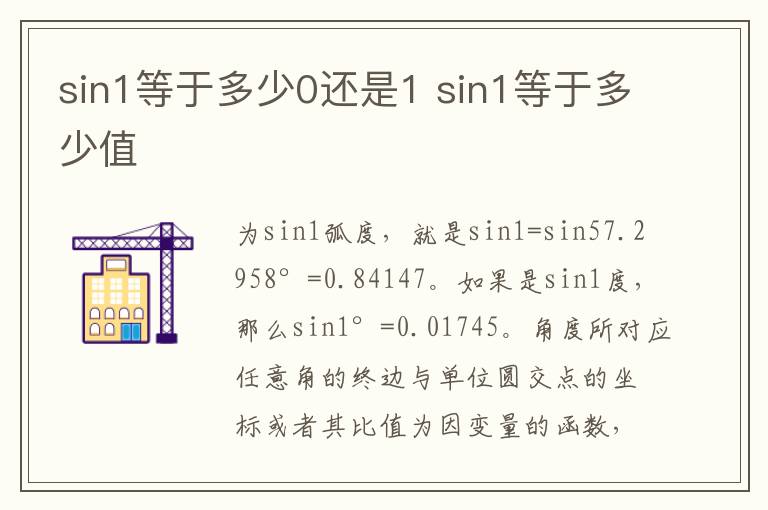 为sin1弧度,就是sin1=sin57.2958°=0.84147。如果是sin1度,那么sin1°=0.01745。角度所对应任意角的终边与单位圆交点的坐标或者其比值为因变量的函数,它们的本质是任意角的集合与一个比值的集合的变量之间的映射。