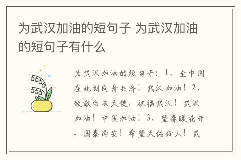 为武汉加油的短句子:1、全中国在此刻同舟共济!武汉加油!2、致敬白衣天使,祝福武汉!武汉加油!中国加油!3、望春暖花开,国泰民安!希望天佑好人!武汉挺住!中国,快快好起来!