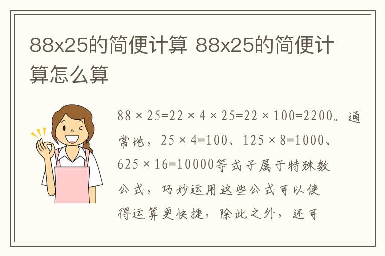 通常地,25×4=100、125×8=1000、625×16=10000等式子属于特殊数公式,巧妙运用这些公式可以使得运算更快捷,除此之外,还可以使用乘法结合律、加法交换律、加法结合律等运算定律。在88×25的简便运算中,不仅使用到了25×4=100这个特殊数公式,还使用到了乘法结合律。