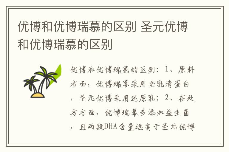 优博和优博瑞慕的区别:1、原料方面,优博瑞幕采用全乳清蛋白,圣元优博采用还原乳;2、在处方方面,优博瑞幕多添加益生菌,且两段DHA含量远高于圣元优博。