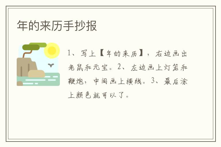 年的来历手抄报 知识分享 1月17日 编辑 童画 取消关注 关注 私信 1、写上【年的来历】,右边画出老鼠和元宝。 2、左边画上灯笼和鞭炮,中间画上横线。 3、最后涂上颜色就可以了。 No related posts. 本文内容由互联网用户自发贡献,该文观点仅代表作者本人。本站仅提供信息存储空间服务,不拥有所有权,不承担相关法律责任。如发现本站有涉嫌抄袭侵权/违法违规的内容, 请发送邮件至 2245678901@qq.com 举报,一经查实,本站将立刻删除。 给TA打赏 共{{data.count}}人 人已打赏