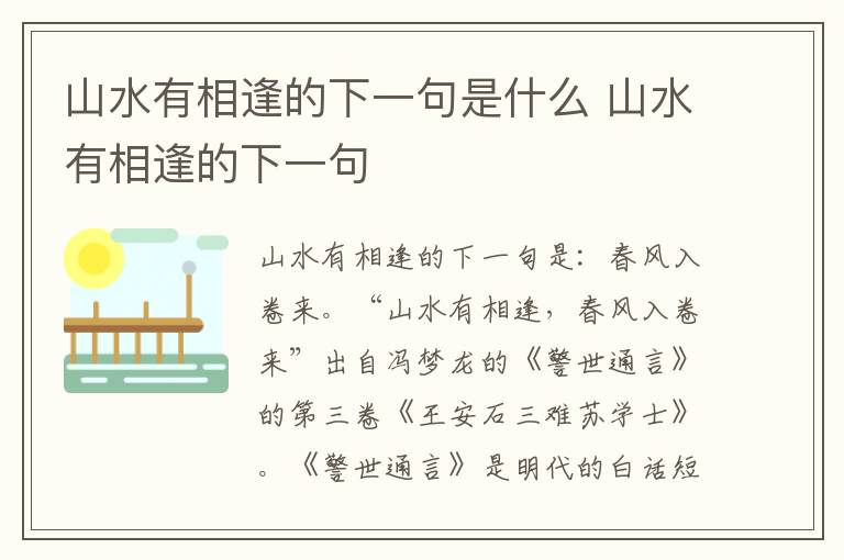 山水有相逢的下一句是:春风入卷来。“山水有相逢,春风入卷来”出自冯梦龙的《警世通言》的第三卷《王安石三难苏学士》。《警世通言》是明代的白话短篇小说集,与《喻世明言》、《醒世恒言》合称为“三言”。