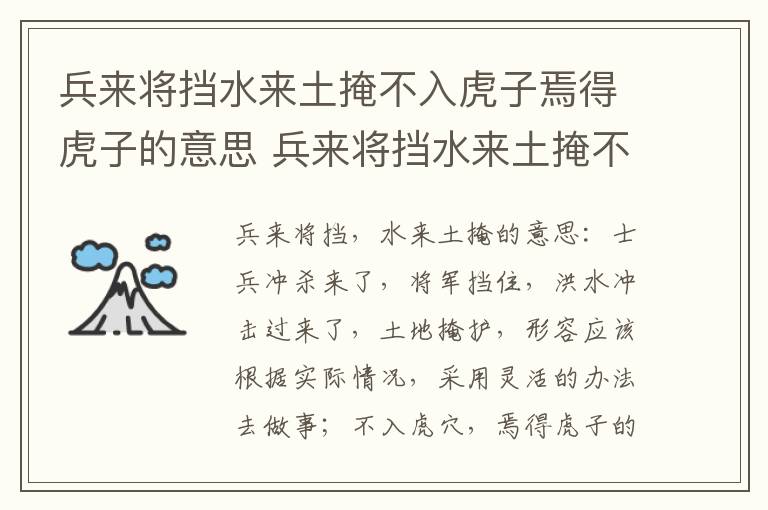 兵来将挡,水来土掩的意思:士兵冲杀来了,将军挡住,洪水冲击过来了,土地掩护,形容应该根据实际情况,采用灵活的办法去做事;不入虎穴,焉得虎子的意思:若不进老虎的巢穴,怎样得到老虎的孩子,常被人引用作不经历危机就不会成功。