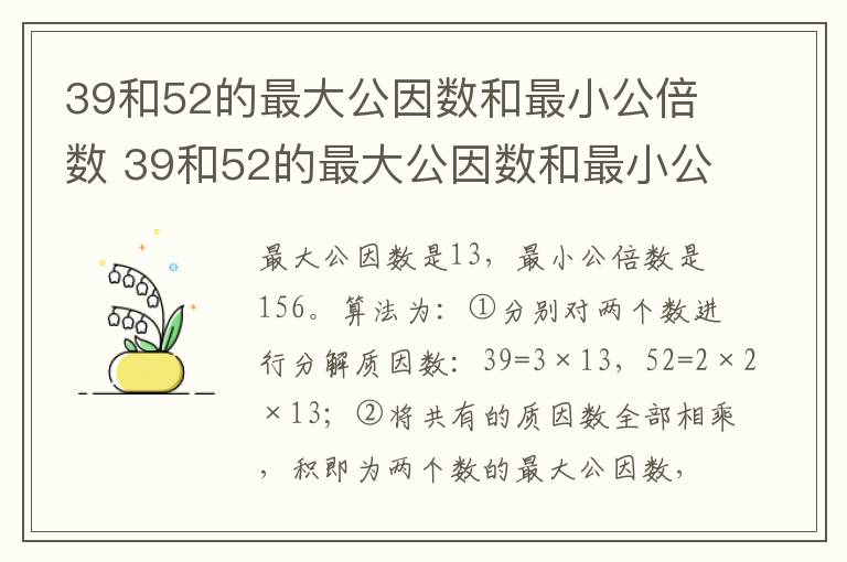 ②将共有的质因数全部相乘,积即为两个数的最大公因数,因为39和52的共有质因数只有13,所以最大公因数是13;