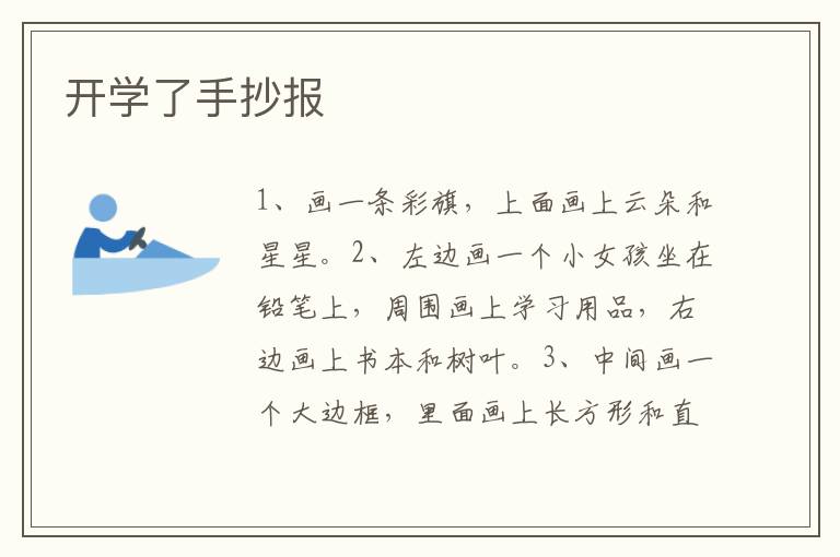 开学了手抄报 知识分享 2月6日 编辑 童画 取消关注 关注 私信 1、画一条彩旗,上面画上云朵和星星。 2、左边画一个小女孩坐在铅笔上,周围画上学习用品,右边画上书本和树叶。 3、中间画一个大边框,里面画上长方形和直尺。 4、最后涂上颜色就可以了。 No related posts. 本文内容由互联网用户自发贡献,该文观点仅代表作者本人。本站仅提供信息存储空间服务,不拥有所有权,不承担相关法律责任。如发现本站有涉嫌抄袭侵权/违法违规的内容, 请发送邮件至 2245678901@qq.com 举报,一经查实,本站将立刻删除。 给TA打赏 共{{data.count}}人 人已打赏
