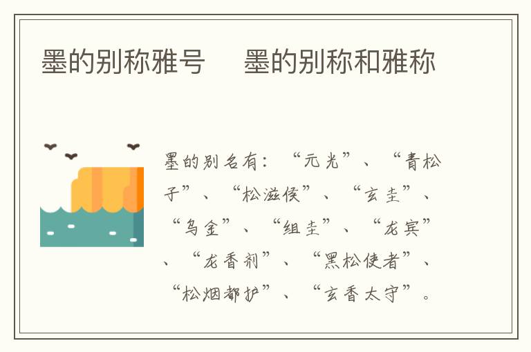 墨的别名有:“元光”、“青松子”、“松滋侯”、“玄圭”、“乌金”、“组圭”、“龙宾”、“龙香剂”、“黑松使者”、“松烟都护”、“玄香太守”。墨是中国古代书写和绘画用到的墨锭。墨的主要原料是炭黑、松烟、胶等,是碳元素以非晶质型态的存在。通过砚用水研磨可以产生用于毛笔书写的墨汁,在水中以胶体的溶液存在。