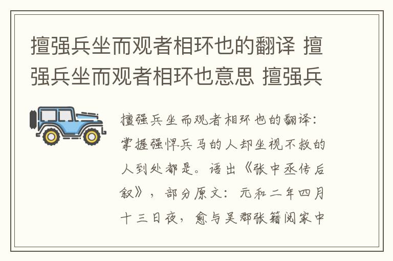 擅强兵坐而观者相环也的翻译:掌握强悍兵马的人却坐视不救的人到处都是。语出《张中丞传后叙》,部分原文:元和二年四月十三日夜,愈与吴郡张籍阅家中旧书,得李翰所为《张巡传》。翰以文章自名,为此传颇详密。然尚恨有阙者,不为许远立传,又不载雷万春事首尾。
