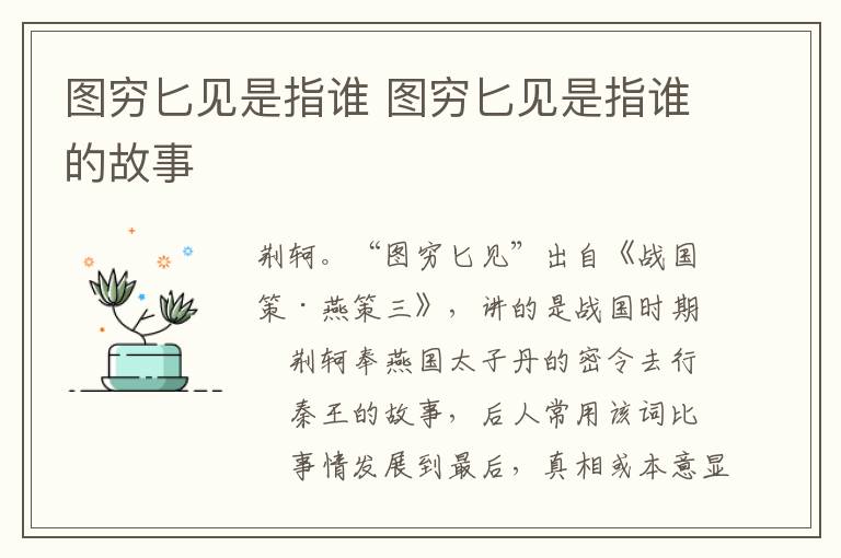 荆轲。“图穷匕见”出自《战国策·燕策三》,讲的是战国时期的荆轲奉燕国太子丹的密令去行刺秦王的故事,后人常用该词比喻事情发展到最后,真相或本意显露了出来。荆轲,姜姓,庆氏,字次非,战国末期卫国人,春秋时期齐国大夫庆封的后代,战国时期著名刺客,也称庆卿、荆卿、庆轲。