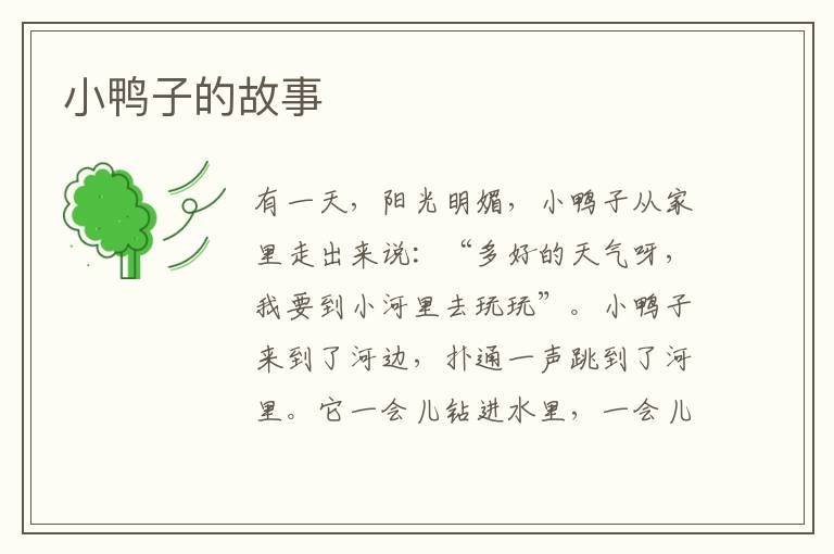 有一天,阳光明媚,小鸭子从家里走出来说:“多好的天气呀,我要到小河里去玩玩”。小鸭子来到了河边,扑通一声跳到了河里。它一会儿钻进水里,一会儿浮出水面,一会儿和小青蛙捉迷藏。突然,小鸭子叫了起来:“哎呀!天都黑了,我该回家了,小青蛙小鲤鱼,再见了”。